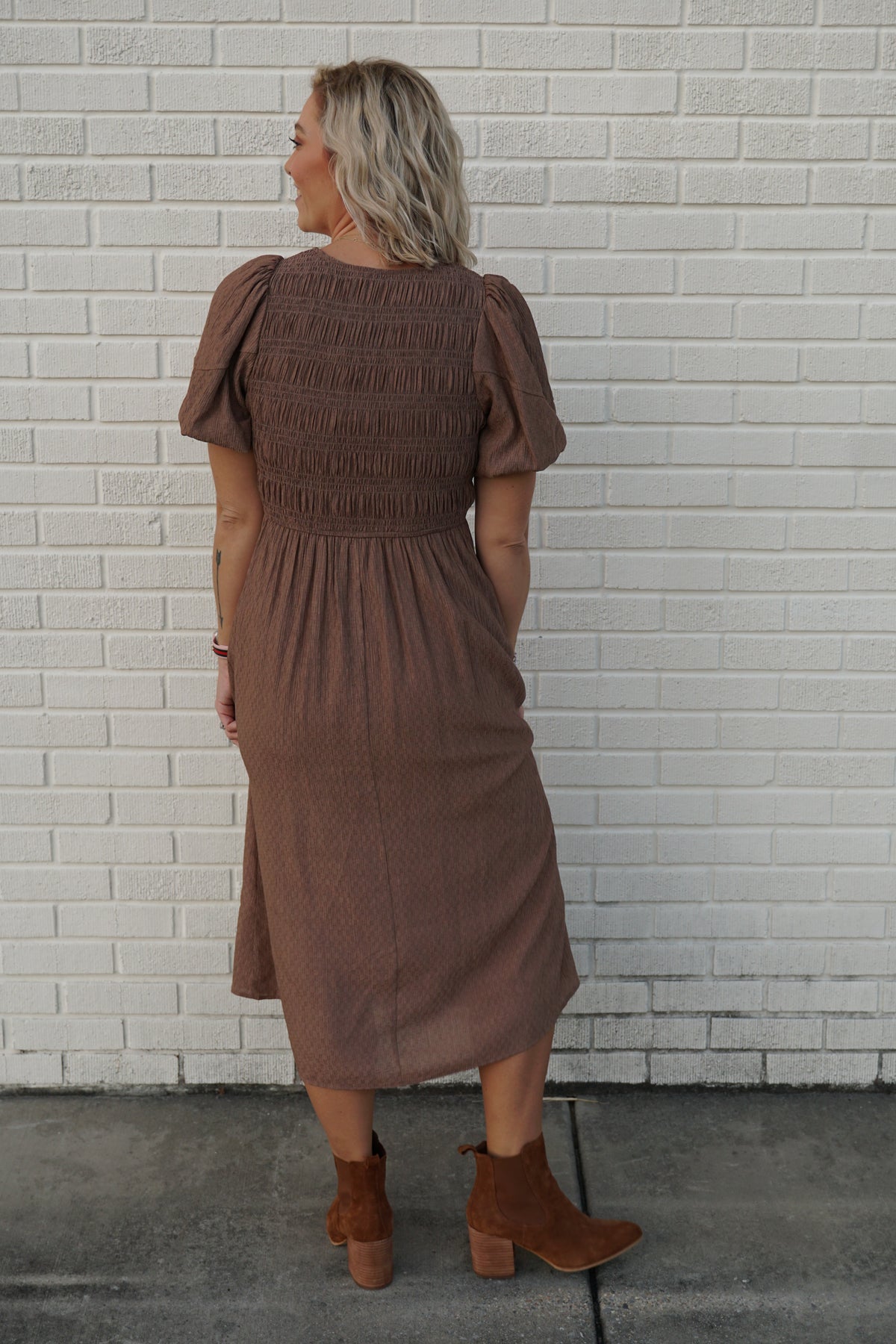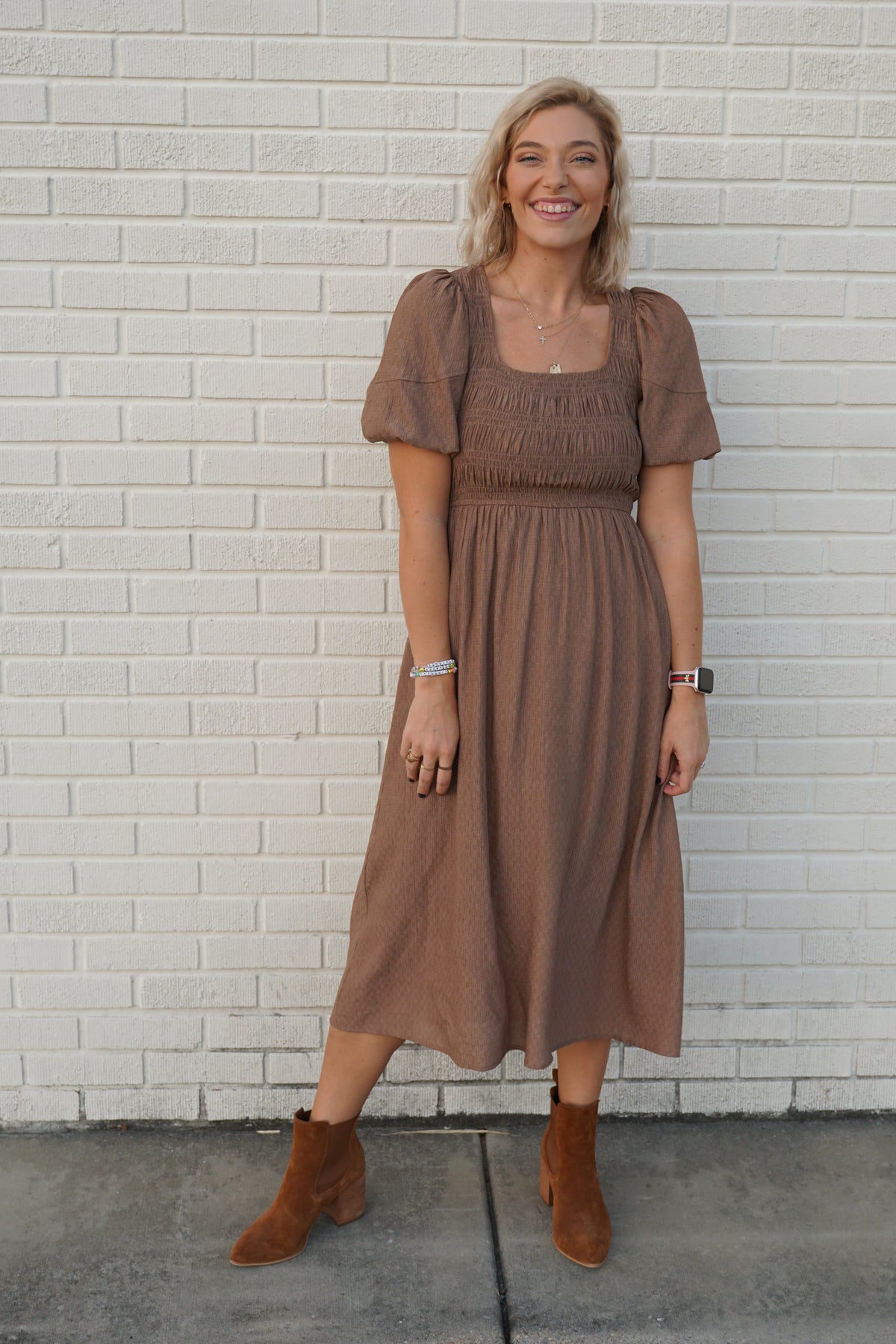 The James dress is one that will look good on any body type. The empire waist is so slimming & the smocked bodice adds the sweetest touch. It is a midi length with short balloon sleeves.