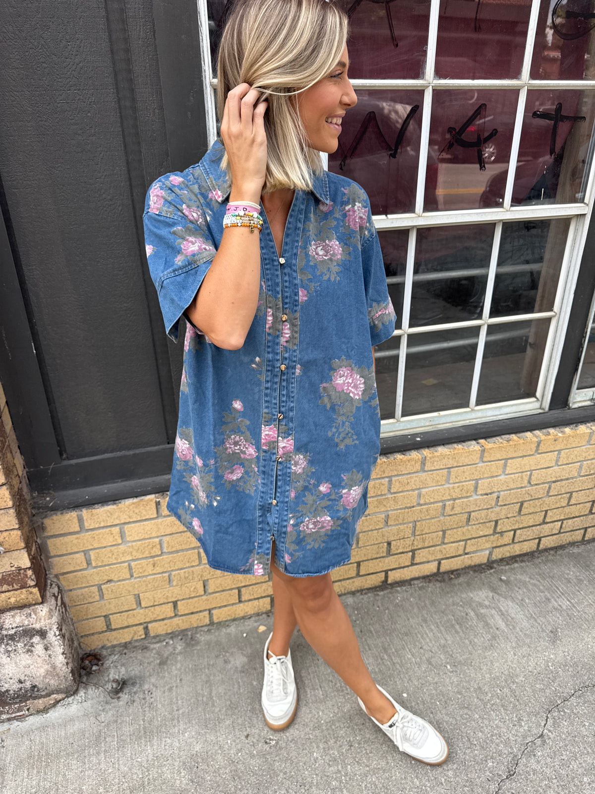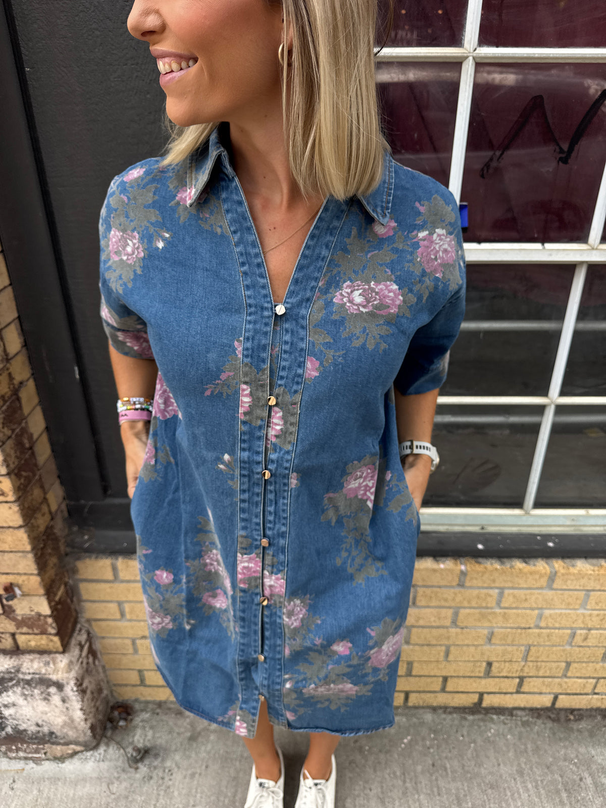 rosy denim dress