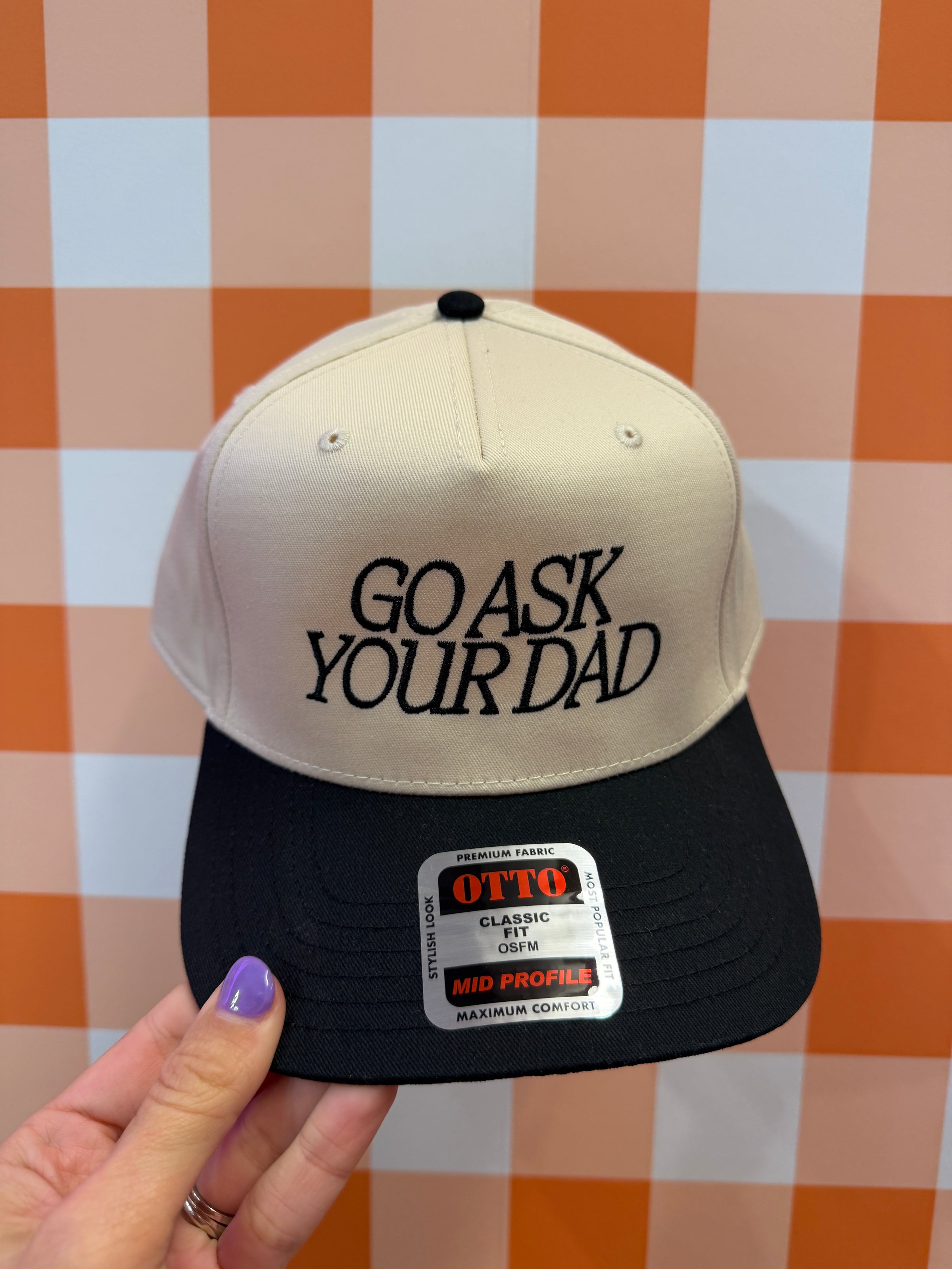 - embroidered “Go Ask Your Dad” lettering