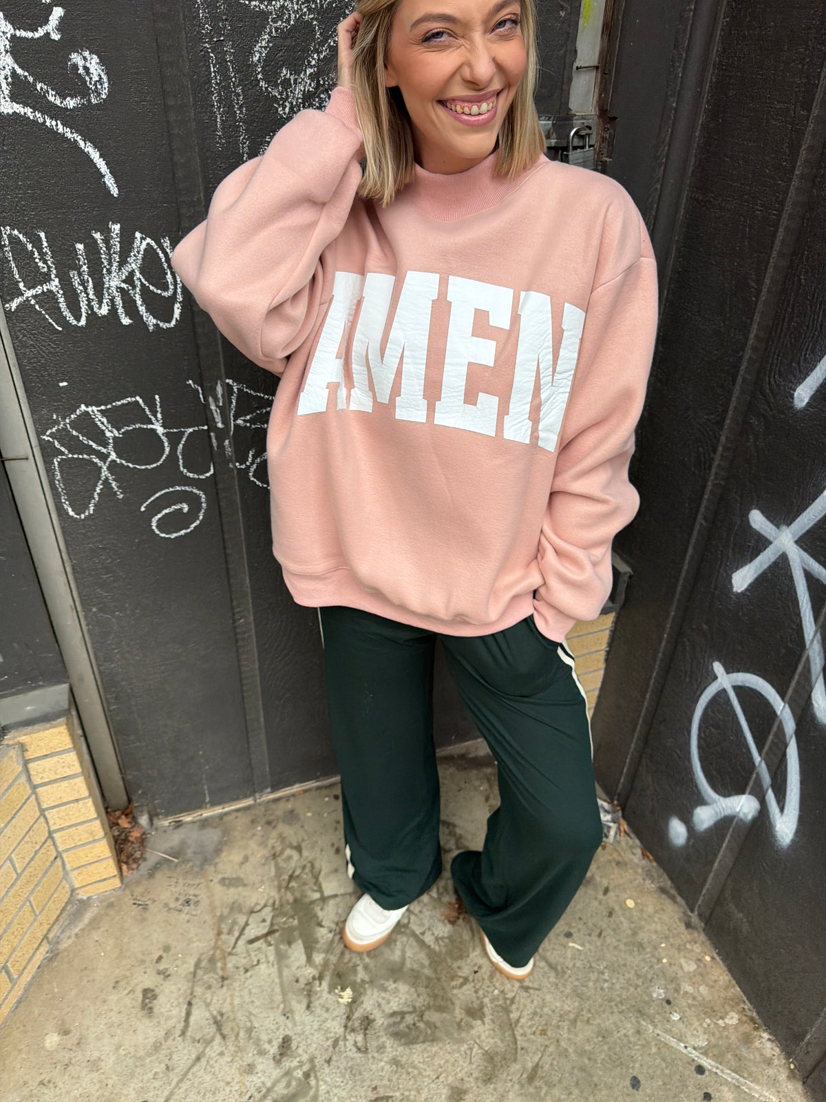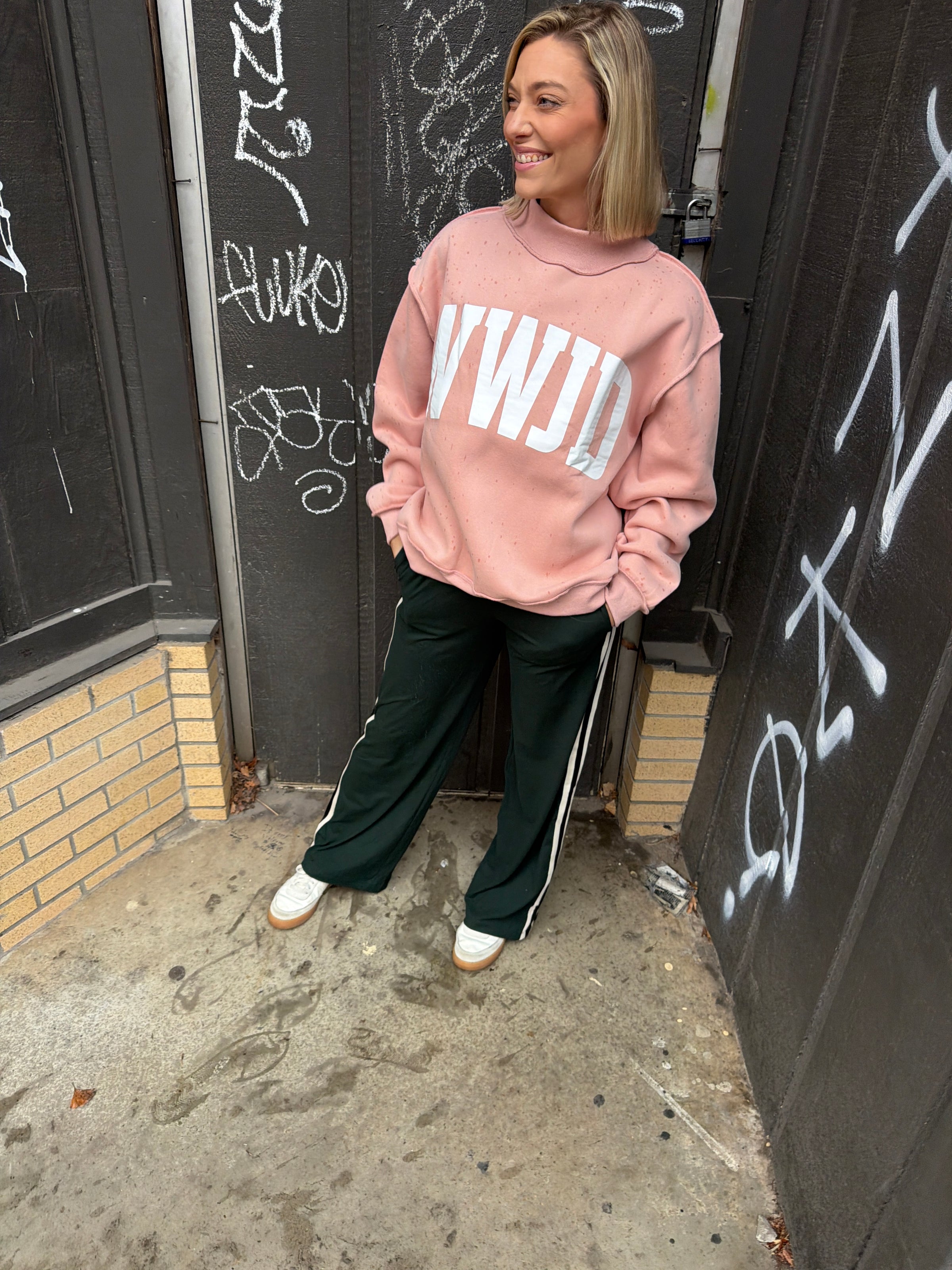 This cozy sweatshirt is a meaningful reminder wrapped in everyday comfort. Featuring “WWJD” boldly on the front and “Amen” printed on the inside, it’s one of those pieces that feels personal without being overdone. The soft blush tone with subtle speckling gives it an effortless, lived-in look that pairs perfectly with joggers, denim, or leggings. It’s faith-forward, cozy, and easy to wear on repeat.
