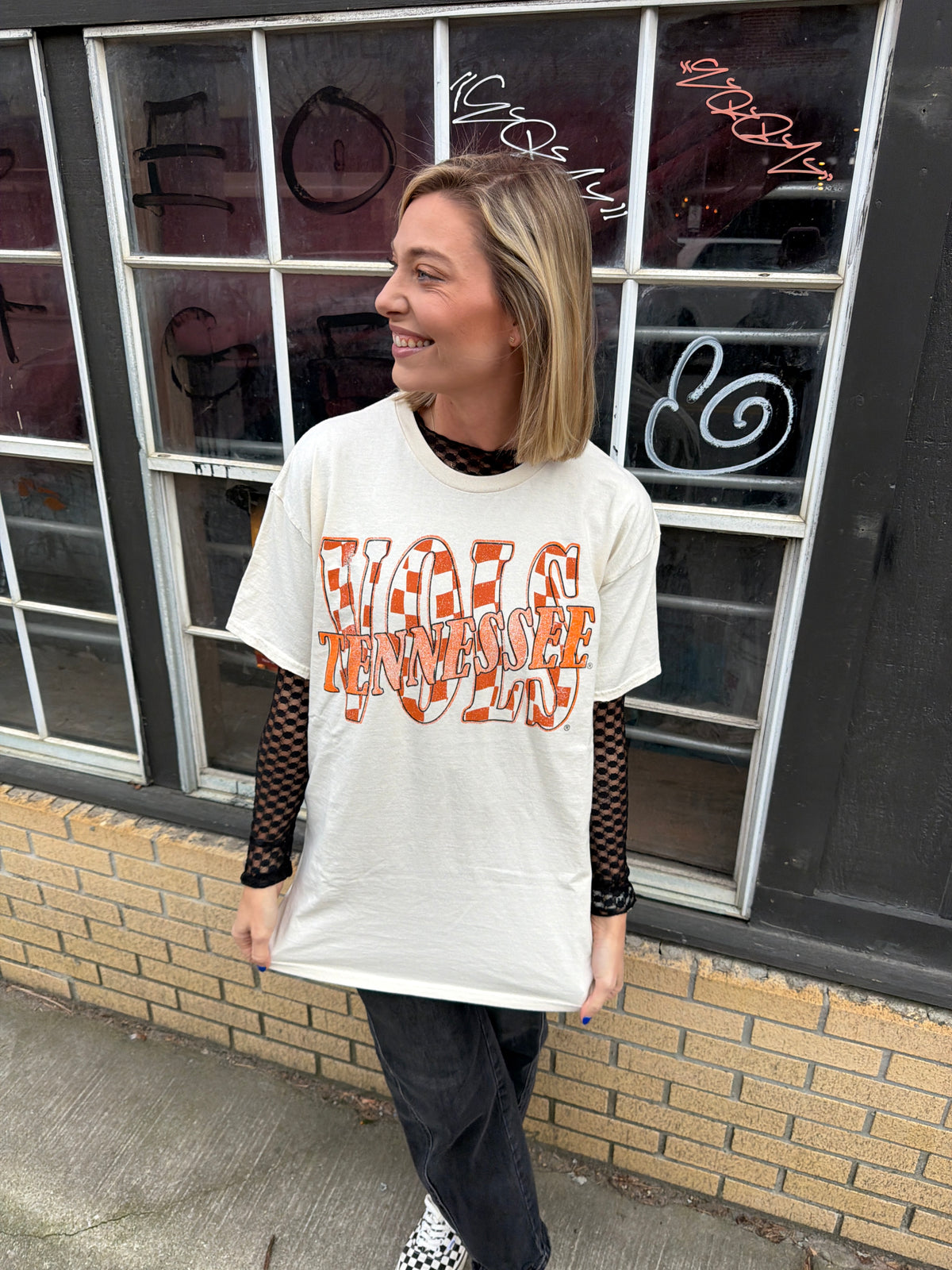 This Tennessee Vols graphic tee brings all the vintage game day vibes. Designed with a bold “Vols” graphic and classic checkerboard-inspired details, it has that perfectly broken-in look that feels like a longtime favorite from the very first wear. The relaxed fit makes it easy to throw on and go, whether you’re heading to a tailgate, watching the game at home, or styling it casually for everyday wear. Pair it with denim, leggings, or layer it over a long sleeve for cooler days — this tee is an easy staple for showing your Tennessee pride in a laid-back, effortless way.