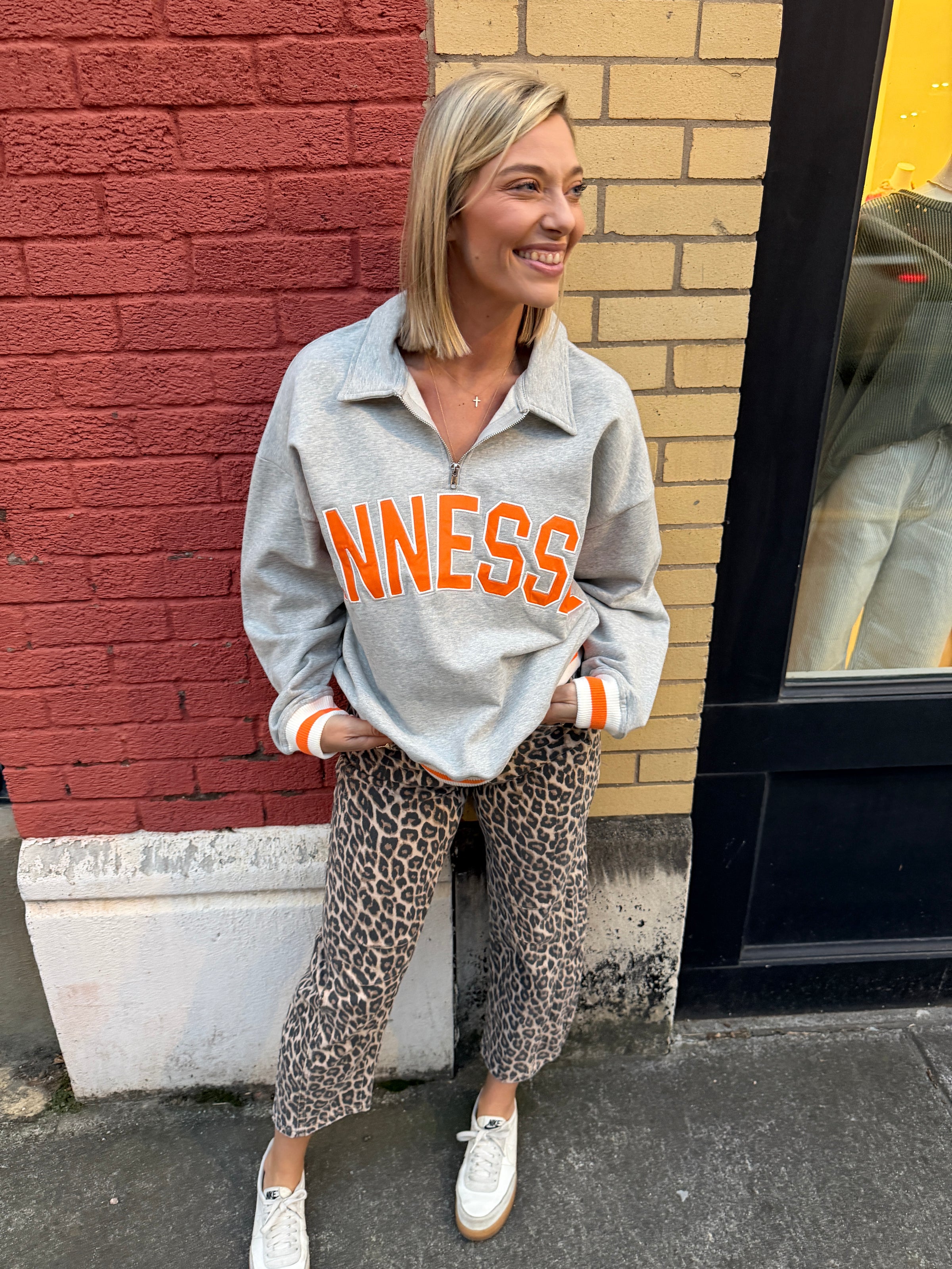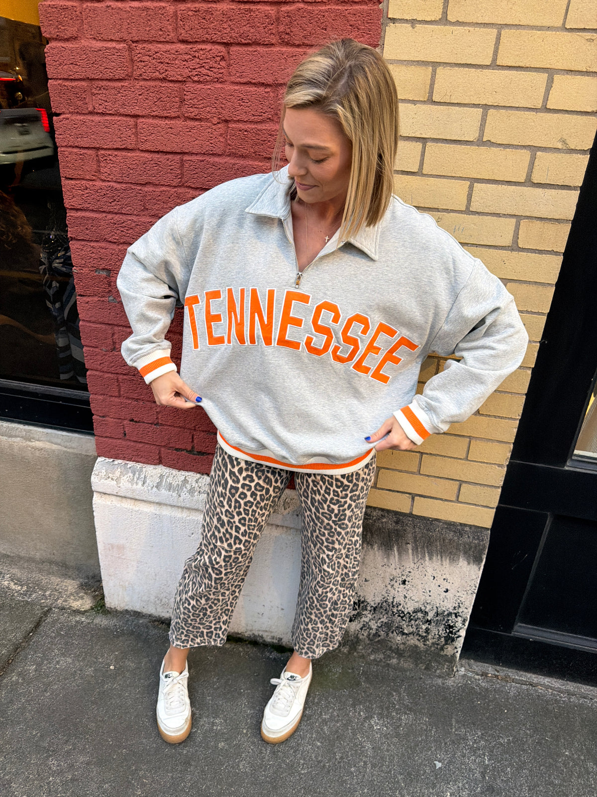 Game day just got a little cozier. This Tennessee Volunteers quarter zip is the perfect throw-on layer for crisp Saturdays, casual tailgates, or everyday wear when you want to rep your team in a relaxed way. The soft gray fleece pairs with bold orange lettering for a classic Vols look that never goes out of style. Designed with a comfortable relaxed fit and ribbed trim at the cuffs and hem, this pullover layers easily over tees and tanks. Whether you’re headed to Neyland or just running errands, this one brings the team spirit without sacrificing comfort.