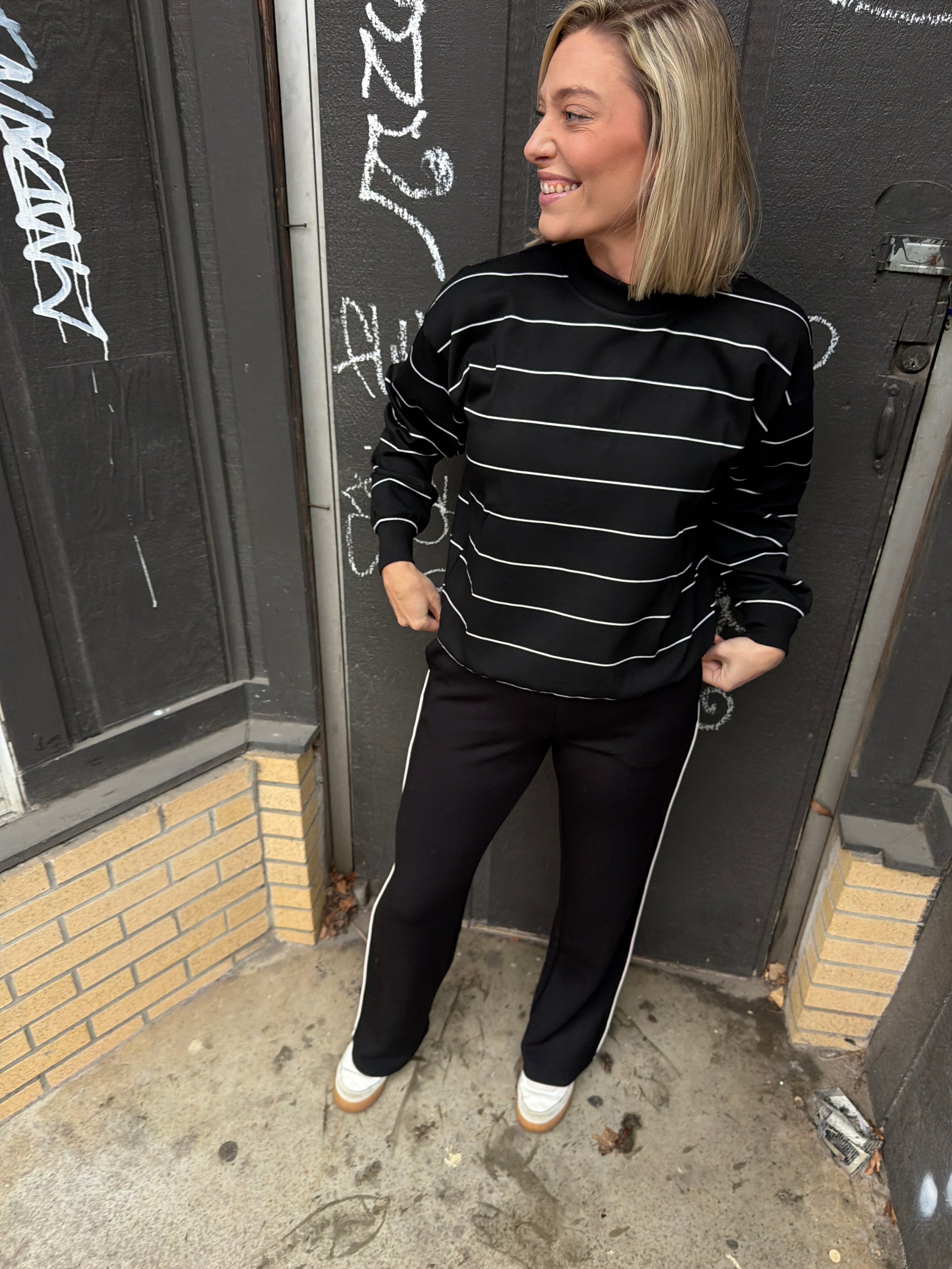 This sweatshirt is cozy, cool, and made to be worn on repeat. The soft fabric and relaxed fit make it an easy everyday staple, while the thin stripe detail gives it that elevated, put-together feel. Wear it with the matching pants for a full set moment, or style it with denim for a casual, effortless look.