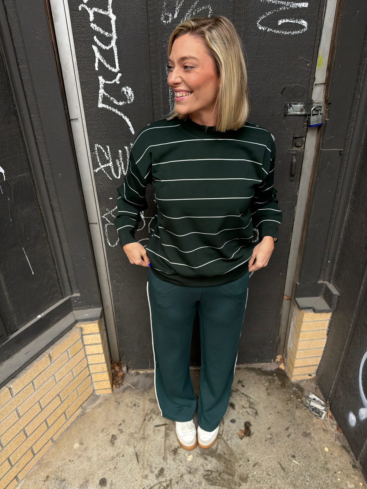This sweatshirt is cozy, cool, and made to be worn on repeat. The soft fabric and relaxed fit make it an easy everyday staple, while the thin stripe detail gives it that elevated, put-together feel. Wear it with the matching pants for a full set moment, or style it with denim for a casual, effortless look.
