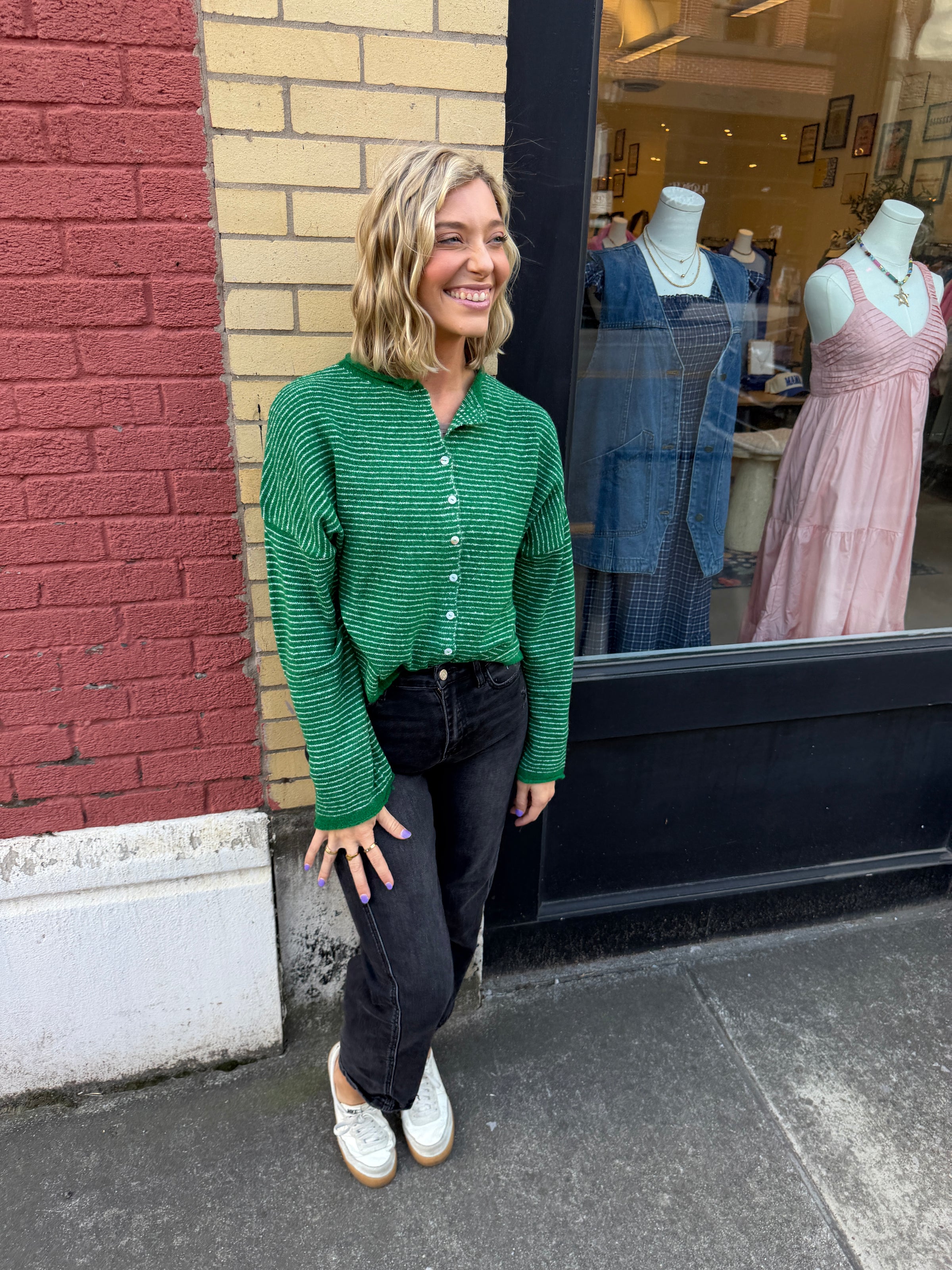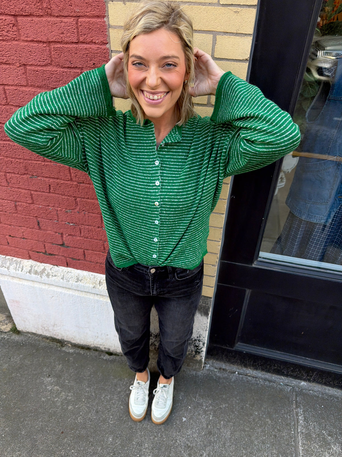 Back by popular demand — with a fresh new look. Our emmie cardigan has sold out every single time we’ve carried it, so when it returned in this new green stripe colorway, we knew it wouldn’t last long. This fan-favorite cardigan is the perfect mix of cozy and cute. The relaxed fit makes it easy to throw on, while the stripe detail adds just enough personality to elevate your everyday outfits. Whether you’re layering it over a tee, tank, or dress, this is one of those pieces you’ll reach for again and again.