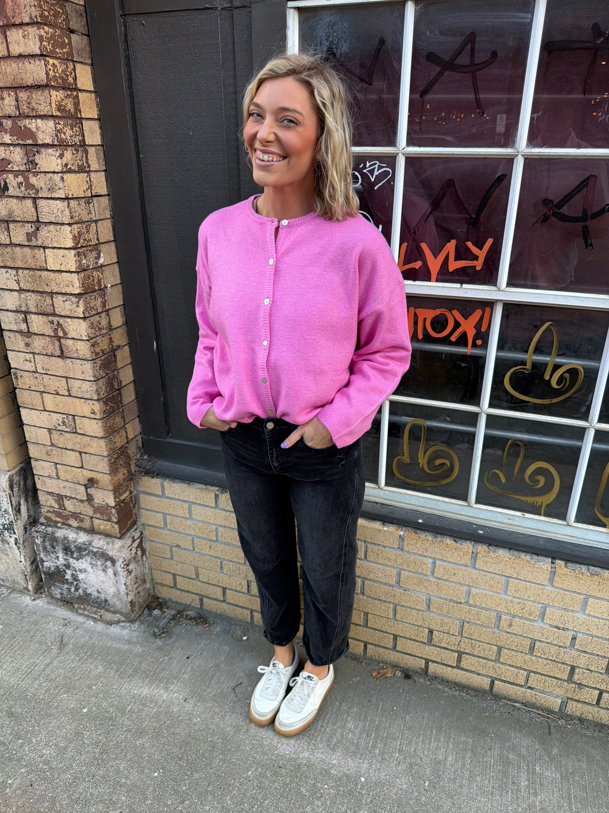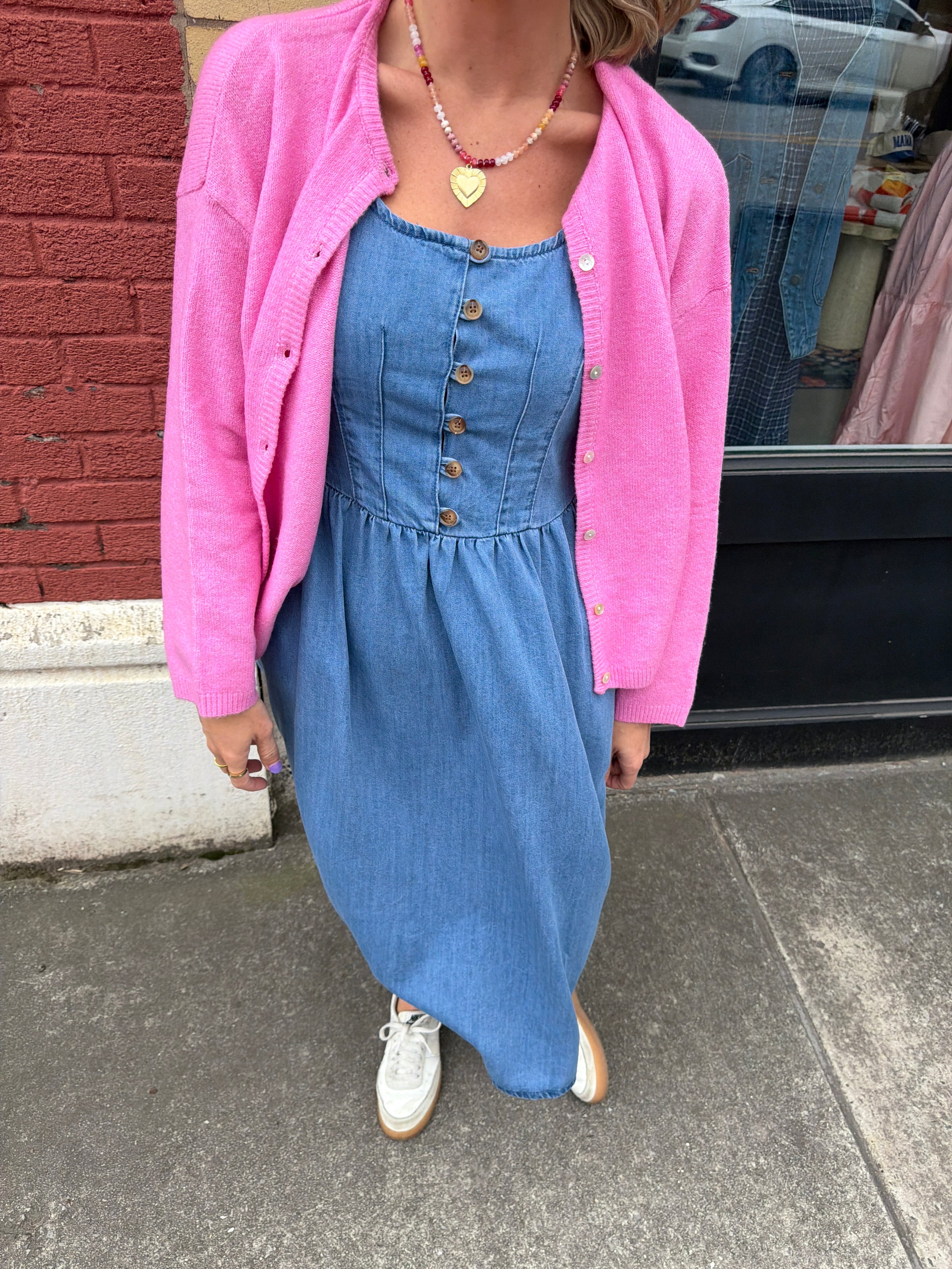 Soft, cozy, and perfectly pink — the polly cardigan is the cardigan your wardrobe has been waiting for. Whether you’re layering it over a tee on cool spring days or throwing it on with jeans for an effortless weekend look, this pink staple adds just the right amount of warmth and style to any outfit. Designed to be comfy without feeling bulky, this piece brings a touch of laid-back charm to everything from errands to brunch dates. It’s the kind of cozy you’ll reach for again and again — because classics never go out of style.